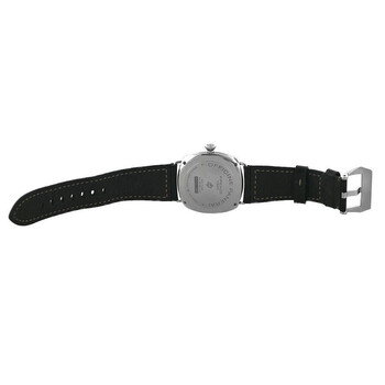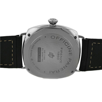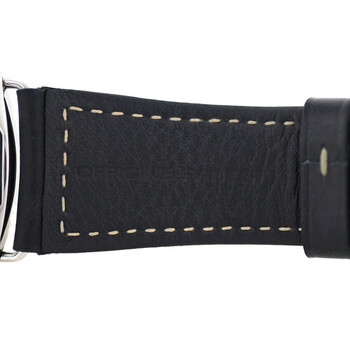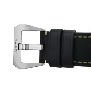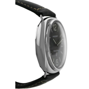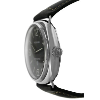 Silver-tone stainless steel case with a black leather strap. Fixed silver-tone stainless steel bezel. Matte black dial with luminous hands and index hour markers. Arabic numerals mark the 3, 6, 9 and 12 o'clock positions. Dial Type: Analog. Luminescent hands and markers. Panerai Calibre P.6000 Hand Wind movement, containing 19 Jewels, bitting at 21600 vph, and has a power reserve of approximately 72 hours. Scratch resistant sapphire crystal. Solid case back. Cushion case shape, case size: 45 mm. Band width: 27 mm. Tang clasp. Water resistant at 100 meters / 330 feet. Functions: hour, minute. Radiomir Series. Luxury watch style. Watch label: Swiss Made. Pre-owned Panerai Radiomir Matte Black Dial Men's Watch PAM00753.