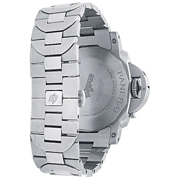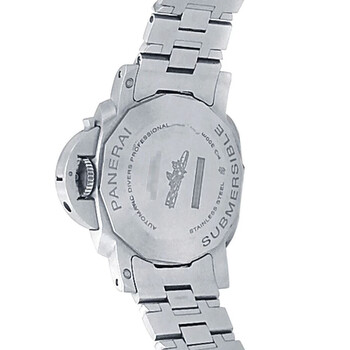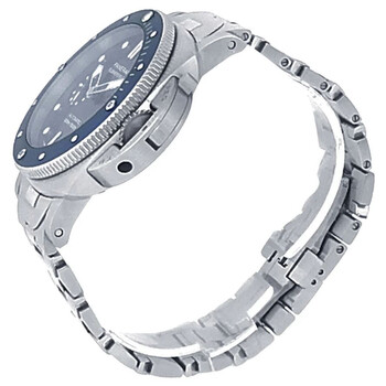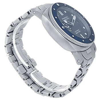 Pre-owned Silver-tone stainless steel case and bracelet. Uni-directional rotating silver-tone stainless steel bezel with ceramic blue ring. Blue dial with silver-tone hands and index hour markers. Dial Type: Analog. Luminescent hands and markers. Date display at the 3 o'clock position. One subdial displaying: small second. Panerai Calibre P.900 Automatic movement, based upon Panerai OP XXXIV, containing 25 Jewels, bitting at 28800 vph, and has a power reserve of approximately 72 hours. Scratch resistant sapphire crystal. Screw down crown. Solid case back. Round case shape, case size: 42 mm. Water resistant at 300 meters / 1000 feet. Functions: date, hour, minute, small second. Submersible Blu Notte Series. Luxury watch style. Watch label: Swiss Made. Panerai Submersible Blu Notte Automatic Blue Dial Men's Watch PAM02068.