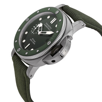 Silver-tone brushed stainless steel case with a green fabric strap. Green polished gradient dial with silver-tone hands and index hour markers. Dial Type: Analog. Luminescent hands and markers. Date display at the 3 o'clock position. One subdial displaying: one- small seconds. Panerai Calibre P.900 Automatic movement, based upon Panerai OP XXXIV, containing 25 Jewels, bitting at 28800 vph, and has a power reserve of approximately 72 hours. Scratch resistant sapphire crystal. Screw down crown. Solid case back. Cushion case shape, case size: 44 mm. Band width: 24/22 mm. Water resistant at 300 meters / 1000 feet. Functions: date, hour, minute, second. Submersible Quarantaquattro Esteel Series. Luxury watch style. Watch label: Swiss Made. Pre-owned Panerai Submersible QuarantaQuattro eSteel Automatic Men's Watch PAM01287.