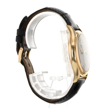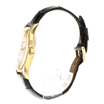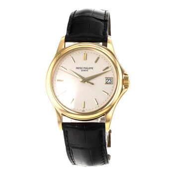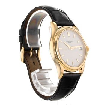 Yellow gold-tone 18kt yellow gold case with a black leather strap. Fixed yellow gold-tone 18kt yellow gold bezel. Silver-tone dial with yellow gold-tone hands and index hour markers. Minute markers around the outer rim. Dial Type: Analog. Date display at the 3 o'clock position. Automatic movement. Scratch resistant sapphire crystal. Round case shape, case size: 37 mm. Buckle clasp. Functions: date, hour, minute, second. Calatrava Series. Luxury watch style. Watch label: Swiss Made. Pre-owned Patek Philippe Calatrava Automatic Silver Dial Men's Watch 5107J-001.
