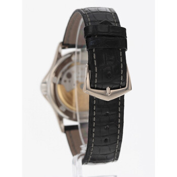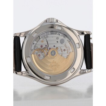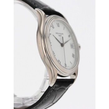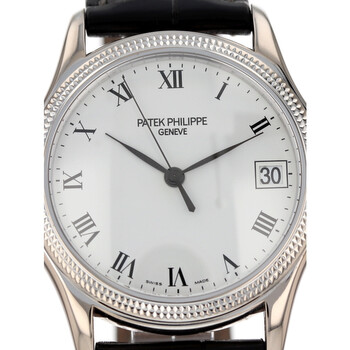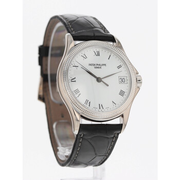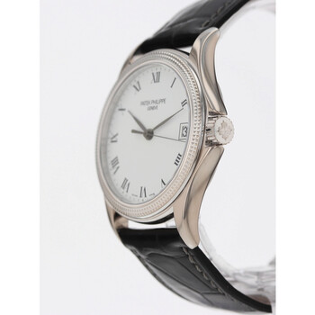 18kt white gold case with a black leather strap. Fixed 18kt white gold bezel. White dial with black hands and Roman numeral hour markers. Minute markers around the outer rim. Dial Type: Analog. Date display at the 3 o'clock position. Three sub-dials displaying: month, date and 24 hour. Patek Philippe Calibre 315 SC Automatic movement, containing 29 Jewels, bitting at 21600 vph, and has a power reserve of approximately 48 hours. Scratch resistant sapphire crystal. Transparent case back. Round case shape, case size: 37 mm. Buckle clasp. Functions: hour, minute, second. Calatrava Series. Luxury watch style. Watch label: Swiss Made. Pre-owned Patek Philippe Calatrava Automatic White Dial Unisex Watch 5117G.
