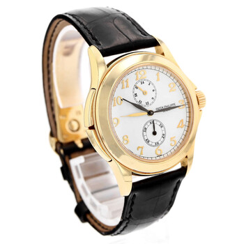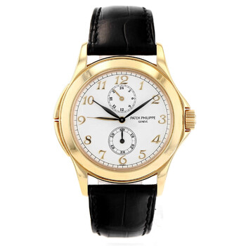 Yellow gold-tone 18kt yellow gold case with a black leather strap. Fixed yellow gold-tone 18kt yellow gold bezel. White dial with black hands and Arabic numeral hour markers. Minute markers around the outer rim. Dial Type: Analog. Hand wind movement. Scratch resistant sapphire crystal. Round case shape, case size: 37 mm. Fold over clasp with a safety release. Functions: hour, minute, second. Calatrava Travel Time Series. Luxury watch style. Watch label: Swiss Made. Pre-owned Patek Philippe Calatrava Travel Time Hand Wind White Dial Men's Watch 5134J-001.