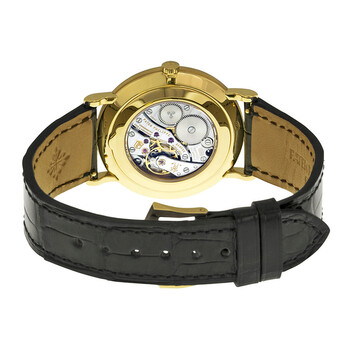 Pre-owned 18kt yellow gold case with a black (patent alligator) leather strap. Fixed 18kt yellow gold bezel. White dial with black hands and Roman numeral hour markers. Dial Type: Analog. Small seconds sub-dial above the 6 o'clock position. Patek Philippe calibre 215 PS hand wind movement with a 44-hour power reserve. Scratch resistant sapphire crystal. Pull / push crown. Transparent sapphire case back. Round case shape. Case size: 36 mm. Case thickness: 7.2 mm. Tang clasp. Water resistant at 30 meters / 100 feet. Functions: hour, minute, small second. Luxury watch style. Watch label: Swiss Made. Item Variations: 5119J 001, 5119J.001, 5119J001. Patek Philippe Calatrava Mechanical White Dial Men's Watch 5119J-001.