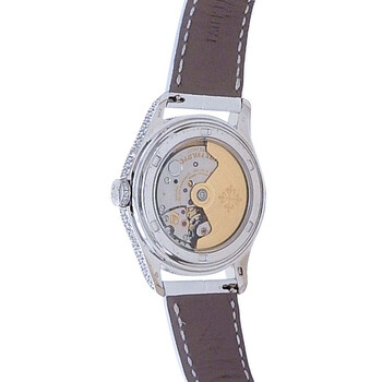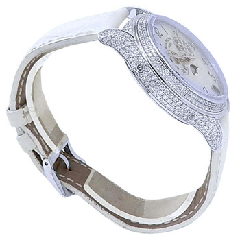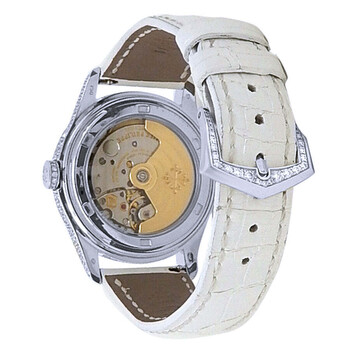 Diamond set 18kt white gold case with a white leather strap. Fixed bezel with diamond set 18kt white gold. Mother of pearl dial with silver-tone hands and Arabic numeral hour markers. Minute markers around the outer rim. Dial Type: Analog. Luminescent hands. Date display at the 6 o'clock position. Three sub-dials displaying: day of the week, month and moonphase. Patek Philippe Calibre 324 S QA LU Automatic movement, containing 34 Jewels, composed of 328 parts, bitting at 28800 vph, and has a power reserve of approximately 45 hours. Scratch resistant sapphire crystal. Transparent see through case back. Round case shape, case size: 37 mm. Buckle clasp. Water resistant at 30 meters / 100 feet. Functions: annual calendar, moon phase, month, date, day, hour, minute, second. Complications Annual Calendar Series. Dress watch style. Watch label: Swiss Made. Item Variations: 4937G. Pre-owned Patek Philippe Complications Annual Calendar Automatic Moon Phase Diamond Ladies Watch 4937G-001.