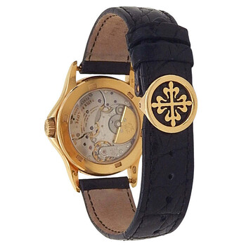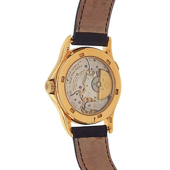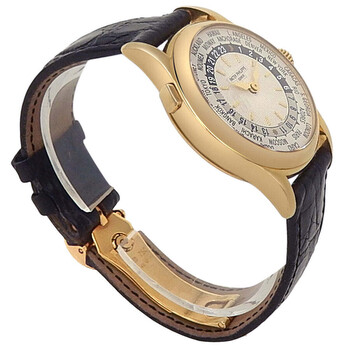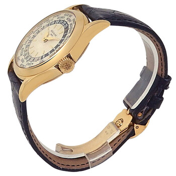 Yellow gold-tone 18kt yellow gold case with a black leather strap. Fixed yellow gold-tone 18kt yellow gold bezel. Silver-tone dial with yellow gold-tone hands and Arabic numeral hour markers. Dial Type: Analog. Patek Philippe Calibre 240/188-HU automatic movement with a 48-hour power reserve. Scratch resistant sapphire crystal. Transparent see through case back. Round case shape, case size: 37 mm. Fold over clasp with a safety release. Water resistant at 30 meters / 100 feet. Functions: date, hour, minute, world time, 24-hour scale and the UTC city ring. Complications World Time Series. Dress watch style. Watch label: Swiss Made. Pre-owned Patek Philippe Complications World Time Automatic Silver Dial Men's Watch 5110J-001.