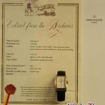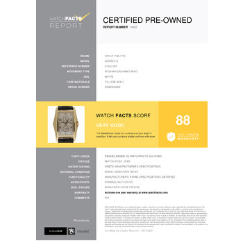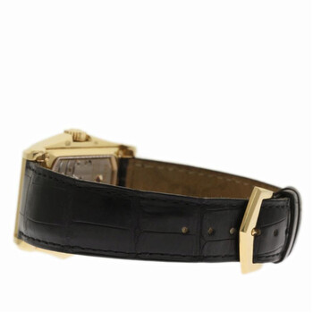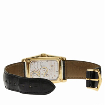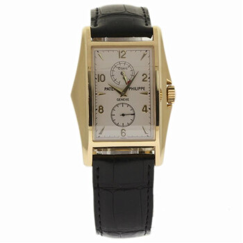 Gold-tone 18kt yellow gold case with a black alligator leather strap. Fixed 18kt yellow gold bezel. White dial with gold-tone hands and Arabic numeral and index hour markers. Minute markers around the outer rim. Dial Type: Analog. Two - small second, power reserved indicator subdials. Hand wind movement. Scratch resistant sapphire crystal. Transparent case back. Rectangle case shape. Case size: 46 mm. Band length: 8.25 inches. Buckle clasp. Water resistant at 30 meters / 100 feet. Functions: hour, minute, second, power reserved indicator. Luxury watch style. Watch label: Swiss Made. Pre-owned Patek Philippe Gondolo White Dial Men's Watch 5100J-001.