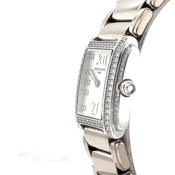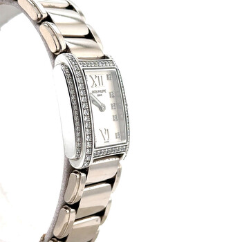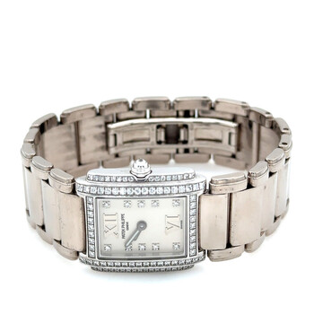 18kt white gold case and bracelet. Fixed bezel with diamond set 18kt white gold. Silver-tone dial with silver-tone hands and diamond hour markers. Dial Type: Analog. Luminescent hands. Quartz movement. Scratch resistant sapphire crystal. Pull / push crown. Solid case back. Rectangle case shape, case size: 22 mm, case thickness: 6 mm. Band width: 20 mm. Hidden clasp. Water resistant at 30 meters / 100 feet. Functions: hour, minute. Twenty-4 Series. Luxury watch style. Watch label: Swiss Made. Pre-owned Patek Philippe Twenty-4 Diamond Silver-tone Dial Ladies Watch 4908/200G-001.