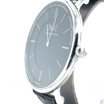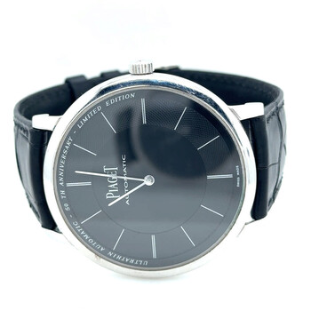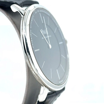 18kt white gold case with a black leather strap. Fixed 18kt white gold bezel. Black dial with silver-tone hands and index hour markers. Dial Type: Analog. Automatic movement. Scratch resistant sapphire crystal. Pull / push crown. Transparent case back. Round case shape, case size: 43 mm, case thickness: 6 mm. Band width: 20 mm. Buckle clasp. Water resistant at 30 meters / 100 feet. Functions: hour, minute. Altiplano Series. Luxury watch style. Watch label: Swiss Made. Pre-owned Piaget Altiplano Automatic Black Dial Men's Watch G0A35133.