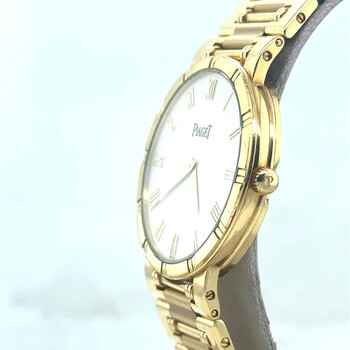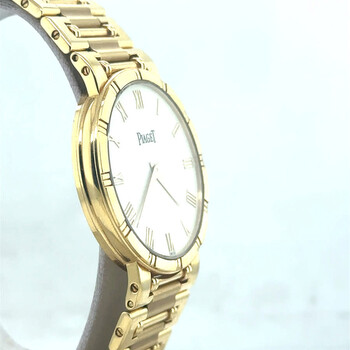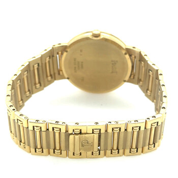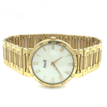 Yellow gold-tone 18kt yellow gold case and bracelet. Fixed yellow gold-tone 18kt yellow gold bezel. Silver-tone dial with yellow gold-tone hands and Roman numeral hour markers. Dial Type: Analog. Quartz movement. Scratch resistant sapphire crystal. Pull / push crown. Solid case back. Round case shape, case size: 33 mm, case thickness: 5 mm. Band width: 20 mm. Hidden clasp. Water resistant at 30 meters / 100 feet. Functions: hour, minute. Dancer Series. Luxury watch style. Watch label: Swiss Made. Pre-owned Piaget Dancer Quartz Silver Dial Unisex Watch 922963.