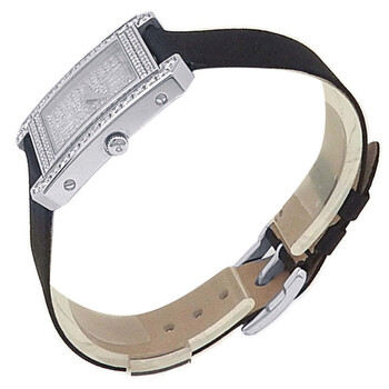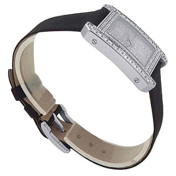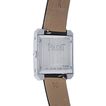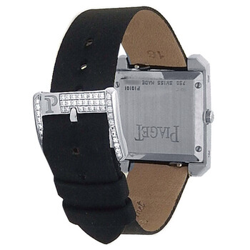 18kt white gold case with a black satin strap. Fixed bezel with diamond set 18kt white gold. Diamond dial with silver-tone hands and Roman numeral hour markers. Dial Type: Analog. Quartz movement. Solid case back. Square case shape, case size: 25 mm. Buckle clasp. Functions: hour, minute. Pave Diamond Series. Dress watch style. Watch label: Swiss Made. Pre-owned Piaget Pave Diamond Quartz Ladies Watch P10101.