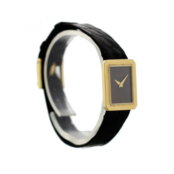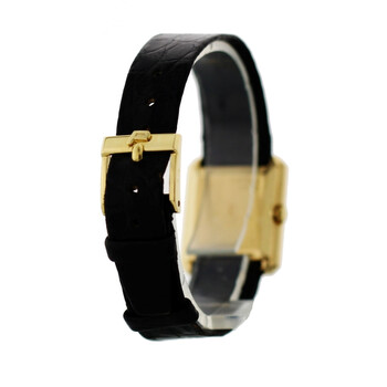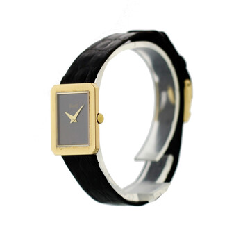 18kt yellow gold case with a black leather strap. Fixed 18kt yellow gold bezel. Black dial with gold-tone hands. Dial Type: Analog. Hand wind movement. Scratch resistant sapphire crystal. Solid case back. Square case shape, case size: 20 mm, case thickness: 4.5 mm. Buckle clasp. Functions: hour, minute. Luxury watch style. Watch label: Swiss Made. Pre-owned Piaget Protocol Black Dial Ladies Watch 9154.