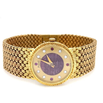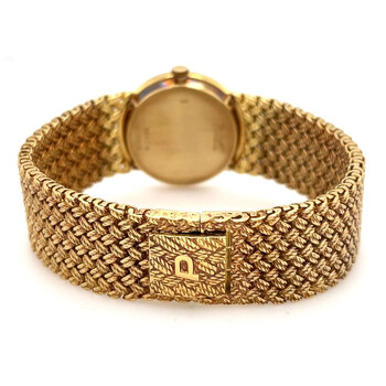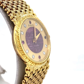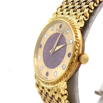 Yellow gold-tone 18kt yellow gold case and bracelet. Fixed yellow gold-tone 18kt yellow gold bezel. Gold-tone dial with yellow gold-tone hands and diamond hour markers. Dial Type: Analog. Hand wind movement. Scratch resistant sapphire crystal. Pull / push crown. Solid case back. Round case shape, case size: 23 mm, case thickness: 6 mm. Band width: 20 mm. Fold over clasp with a safety release. Water resistant at 30 meters / 100 feet. Functions: hour, minute. Vintage Series. Luxury watch style. Watch label: Swiss Made. Pre-owned Piaget Vintage Hand Wind Diamond Gold Dial Ladies Watch 942 D 4.
