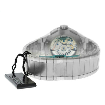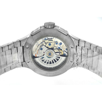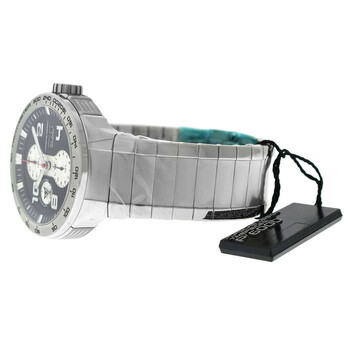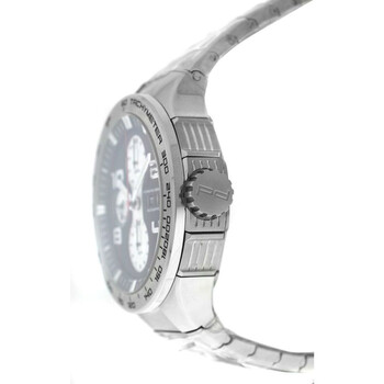 Silver-tone stainless steel case and bracelet. Fixed tachymeter scale silver-tone stainless steel bezel. Black dial with silver-tone hands and Arabic numeral & index hour markers. Minute markers around the outer rim. Dial Type: Analog. Luminescent hands and markers. Day of the week and date display at the 3 o'clock position. Chronograph - three sub-dials displaying: 60 second, 30 minute and 12 hour. Automatic movement. Transparent see through case back. Round case shape, case size: 44 mm, case thickness: 15 mm. Deployment with push button release clasp. Water resistant at 120 meters / 400 feet. Functions: chronograph, day, date, hour, minute, second. Flat Six P6340 Series. Casual watch style. Watch label: Swiss Made. Pre-owned Porsche Design Flat Six P6340 Chronograph Automatic Black Dial Men's Watch 6340.41.43.0251.