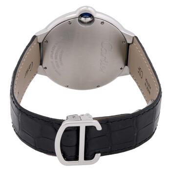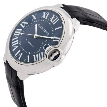 Silver-tone stainless steel case with a black (alligator) leather strap. Fixed silver-tone stainless steel bezel. Blue dial with luminous silver-tone sword-shaped hands and Roman numeral hour markers. Minute markers around an inner ring. Dial Type: Analog. Luminescent hands and markers. Date display at the 3 o'clock position. Cartier Calibre 1847 MC Automatic movement, containing 23 Jewels, bitting at 28800 vph, and has a power reserve of approximately 42 hours. Scratch resistant sapphire crystal. Pull / push set with a synthetic blue cabochon crown. Solid case back. Round case shape, case size: 42 mm, case thickness: 13 mm. Slide through clasp. Water resistant at 30 meters / 100 feet. Functions: date, hour, minute, second. Additional Info: crown set with a cabochon-shaped synthetic spinel. Ballon Bleu De Cartier Series. Luxury watch style. Watch label: Swiss Made. Pre-owned Pre-owned Cartier Ballon Bleu Automatic Blue Dial Men's Watch WSBB0025.