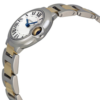 Silver-tone stainless steel case with a two-toned stainless steel with 18kt yellow gold bracelet. Fixed silver-tone stainless steel bezel. Silver dial with blued-steel sword-shaped hands and Roman numeral hour markers. Minute markers around an inner ring. Dial Type: Analog. Cartier Calibre 057 quartz movement. Scratch resistant sapphire crystal. 18kt yellow gold set with blue cabochon crown. Solid case back. Round case shape, case size: 28.2 mm, case thickness: 9.5 mm. Hidden deployment clasp. Water resistant at 30 meters / 100 feet. Functions: hour, minute. Additional Info: inset 18kt yellow gold crown. Ballon Bleu De Cartier Series. Luxury watch style. Watch label: Swiss Made. Pre-owned Pre-owned Cartier Ballon Bleu Silver Dial Ladies Watch W69007Z3.