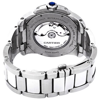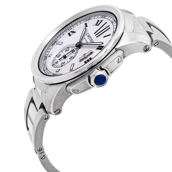 Silver-tone stainless steel case and bracelet. Fixed silver-tone stainless steel bezel. Silver opaline dial with luminous black sword-shaped hands and Roman numeral hour markers. Minute markers around the outer rim. Dial Type: Analog. Luminescent hands and markers. Date display at the 3 o'clock position. One subdial displaying: small second. Cartier Calibre 1904-PS MC Automatic movement, containing 27 Jewels, bitting at 28800 vph, and has a power reserve of approximately 48 hours. Scratch resistant sapphire crystal. Steel with a faceted blue synthetic spinel crown. Skeleton case back. Round case shape, case size: 42 mm, case thickness: 10 mm. Band width: 24 mm, band length: 7 3/4 inches. Deployment clasp. Water resistant at 30 meters / 100 feet. Functions: date, hour, minute, second. Calibre De Cartier Series. Dress watch style. Watch label: Swiss Made. Pre-owned Pre-owned Cartier Calibre de Cartier Automatic Men's Watch W7100015.