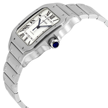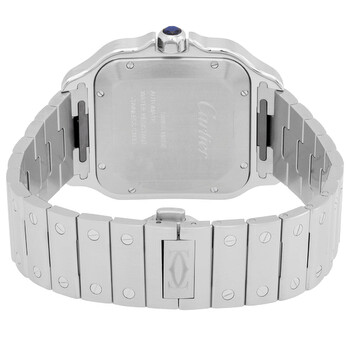 Silver-tone stainless steel case and bracelet. Fixed silver-tone stainless steel bezel. Silvered opaline dial with blued-steel sword-shaped hands and black Roman numeral hour markers. Minute markers around an inner ring. Dial Type: Analog. Date display at the 6 o'clock position. Cartier Calibre 1847 MC Automatic movement, containing 23 Jewels, bitting at 28800 vph, and has a power reserve of approximately 42 hours. Scratch resistant sapphire crystal. Blue cabochoon crown. Solid case back. Square case shape, case size: 39.8 mm x 47.5 mm, case thickness: 9.08 mm. Deployment clasp. Water resistant at 100 meters / 330 feet. Functions: date, hour, minute, second. Santos Series. Luxury watch style. Watch label: Swiss Made. Pre-owned Cartier Santos Automatic Men's Watch WSSA0018.