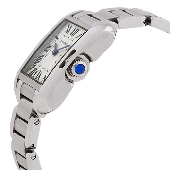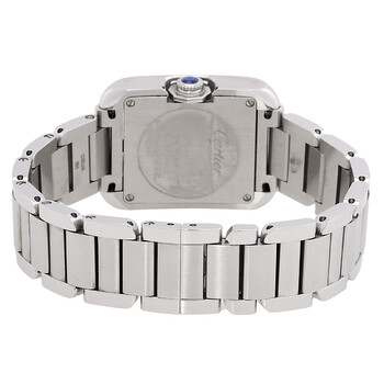 Silver-tone stainless steel case and bracelet. Fixed silver-tone stainless steel bezel. Silver flinque dial with blued-steel sword-shaped hands and Roman numeral hour markers. Minute markers around an inner ring. Dial Type: Analog. Cartier Calibre 057 quartz movement. Scratch resistant sapphire crystal. Pull / push sapphire cabochon. crown. Solid case back. Rectangle case shape, case size: 30.2 mm x 22.7 mm, case thickness: 7.19 mm. Hidden fold over clasp. Water resistant at 30 meters / 100 feet. Functions: hour, minute. Tank Anglaise Series. Casual watch style. Watch label: Swiss Made. Pre-owned Cartier Tank Anglaise Silver Dial Ladies Watch W5310022.