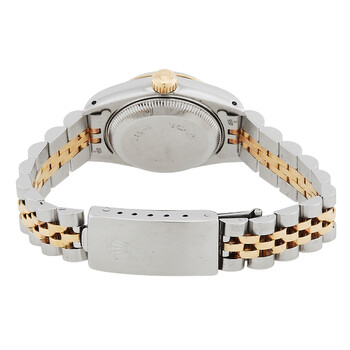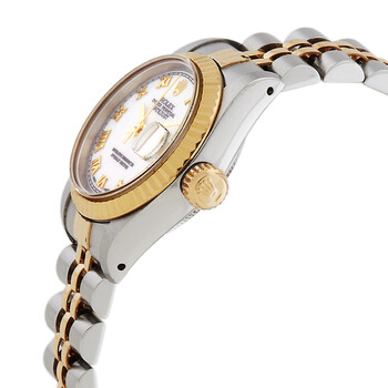 Silver-tone stainless steel case with a two-tone (silver-tone and gold-tone) 18kt yellow gold and stainless steel jubilee bracelet. Fixed fluted yellow gold 18kt yellow gold bezel. White dial with gold-tone hands and Roman numeral hour markers. Minute markers around the outer rim. Dial Type: Analog. Date display at the 3 o'clock position. Rolex Calibre 2135 Automatic movement, containing 29 Jewels, bitting at 28800 vph, and has a power reserve of approximately 42 hours. Scratch resistant sapphire crystal. Screw down crown. Solid case back. Round case shape, case size: 26 mm. Band length: 6 1/2 inches. Fold over clasp. Water resistant at 100 meters / 330 feet. Functions: hours, minutes, seconds, date. Datejust Series. Luxury watch style. Watch label: Swiss Made. Pre-owned Pre-owned Rolex Datejust White Dial Jubilee Bracelet Ladies Watch 69173WRJ 26 mm.