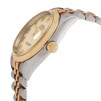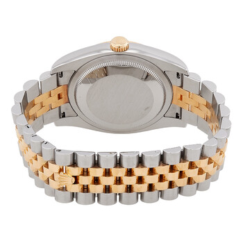 Silver-tone stainless steel case with a two-tone (silver-tone and gold-tone) stainless steel and 18kt yellow gold rolex jubilee bracelet. Fixed fluted gold-tone 18kt yellow gold bezel. White dial with yellow gold-tone hands and Roman numeral hour markers. Minute markers around the outer rim. Dial Type: Analog. Luminescent hands and dial markers. Date display at the 3 o'clock position. Rolex Calibre 3135 Automatic movement, containing 31 Jewels, bitting at 28800 vph, and has a power reserve of approximately 48 hours. Scratch resistant sapphire crystal. Screw down crown. Solid case back. Round case shape, case size: 36 mm. Band length: 7 inches. Hidden deployment clasp. Water resistant at 100 meters / 330 feet. Functions: date, hour, minute, second, chronometer. Oyster Perpetual Series. Luxury watch style. Watch label: Swiss Made. Pre-owned Pre-owned Rolex Oyster Perpetual Automatic Chronometer White Dial Men's Watch 116233-WRJ.