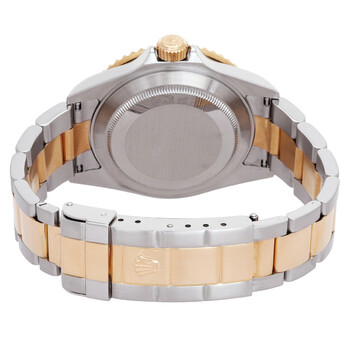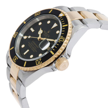 Silver-tone stainless steel case with a two-tone (silver-tone and gold-tone) 18kt yellow gold and stainless steel oyster bracelet. Uni-directional rotating black 18kt yellow gold and ceramic bezel. Black dial with gold-tone hands and index hour markers. Minute markers around the outer rim. Dial Type: Analog. Luminescent hands and markers. Date display at the 3 o'clock position. Rolex Calibre 3135 Automatic movement, containing 31 Jewels, bitting at 28800 vph, and has a power reserve of approximately 48 hours. Scratch resistant sapphire crystal. Screw down crown. Solid case back. Round case shape, case size: 40 mm, case thickness: 12.5 mm. Band width: 20 mm, band length: 7 inches. Oysterlock clasp. Water resistant at 300 meters / 1000 feet. Functions: hours, minutes, seconds, date. Submariner Series. Dive watch style. Watch label: Swiss Made. Pre-owned Rolex Submariner Automatic Black Dial Men's Watch 16613BKSO.
