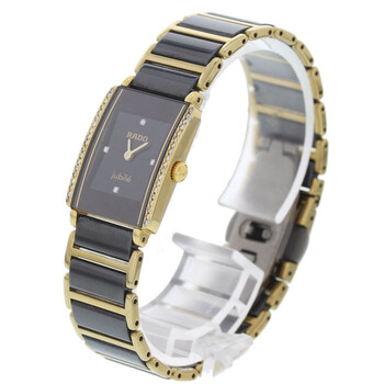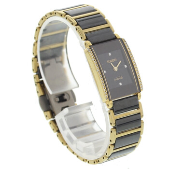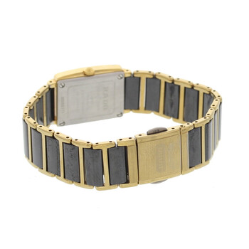 Rado Jubile DiaStar Diamonds 153.0339.3. 19 mm 18k yellow gold case with stainless steel back. 18k yellow gold bezel with diamonds. Black dial with diamond markers and gold hands. Grey and yellow gold ceramic band with titanium fold over clasp with double push button safety. Will fit u to 6 inch wrist. Quartz movement. Sapphire glass. Box is included. Dial Type: Analog. Quartz movement. Scratch resistant sapphire crystal. Screw down crown. Solid case back. Rectangle case shape, case size: 19 mm, case thickness: 5 mm. Band length: 6 inches. Butterfly clasp. Functions: hour, minute. Luxury watch style. Pre-owned Rado Diastar BlackDial Ladies Watch 153.0339.3.