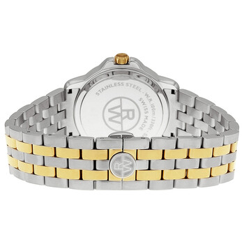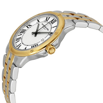 Stainless steel case with a two-tone (silver-tone and gold-tone) stainless steel bracelet. Fixed gold-tone bezel. White dial with black hands and Roman numeral hour markers. Minute markers around an inner ring. Dial Type: Analog. Luminescent hands. Date display at the 3 o'clock position. Quartz movement. Scratch resistant sapphire crystal. Pull / push crown. Solid case back. Round case shape. Case size: 39 mm. Band width: 18 mm. Deployment with double push button clasp. Water resistant at 50 meters / 165 feet. Functions: date, hour, minute, second. Dress watch style. Watch label: Swiss Made. Pre-owned Raymond Weil Tango White Dial Two-Tone Steel With Gold PVD Men's Watch 5591-STP-00300. Box: Yes ,Paper: No