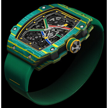 Green and yellow quartz tpt case with a green seamless elastic strap band. Fixed green quartz tpt bezel. Skeletal dial with silver-tone hands and index hour markers. Dial Type: Analog. Luminescent hands and markers. Richard Mille Calibre CRMA7 automatic movement with a 50-hour power reserve. Scratch resistant sapphire crystal. Transparent case back. Tonneau case shape, case size: 38.7 mm x 47.52 mm, case thickness: 7.8 mm. Water resistant at 50 meters / 165 feet. Functions: hour, minute. Sport watch style. Watch label: Swiss Made. Pre-owned Richard Mille RM 67-02 Wayne Van Niekerk Automatic Skeletal Dial Men's Watch RM67-02.