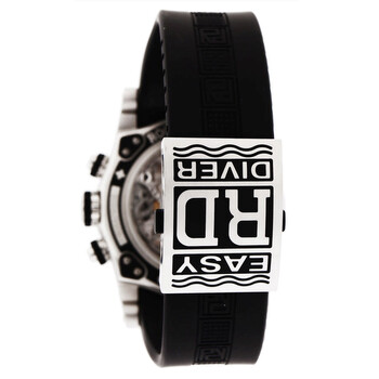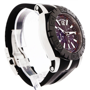 Silver-tone stainless steel case with a black rubber strap. Black stainless steel bezel. Black dial with silver-tone hands and index hour markers. Minute markers around the outer rim. Dial Type: Analog. Luminescent hands and markers. Automatic movement. Scratch resistant sapphire crystal. Transparent see through case back. Round case shape, case size: 46 mm. Deployment with push button release clasp. Functions: chronograph, hour, minute, second. Easy Diver Series. Luxury watch style. Watch label: Swiss Made. Pre-owned Roger Dubuis Easy Diver Chronograph Automatic Black Dial Men's Watch DBSE0282.