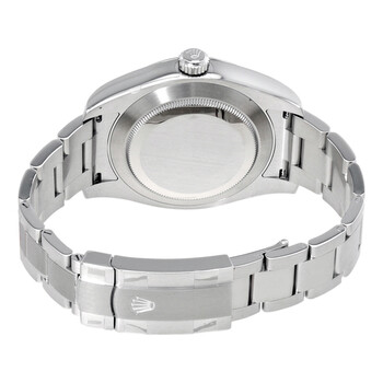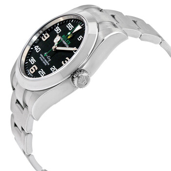 Pre-owned Stainless steel case with a stainless steel bracelet. Fixed stainless steel bezel. Black dial with luminous silver-tone Mercedes-logo, sword, and Breguet-style shape hands and index hour markers. Arabic numeral hour markers at the 3, 6 and 9 o'clock positions. Arabic numeral minute markers (at 5 minute intervals). Minute markers around the outer rim. Dial Type: Analog. Rolex calibre 3131 automatic movement with a 48-hour power reserve. Scratch resistant sapphire crystal. Screw down crown. Solid case back. Round case shape. Case size: 40 mm. Oysterlock clasp. Water resistant at 100 meters / 330 feet. Functions: hour, minute, second, chronometer. Luxury watch style. Watch label: Swiss Made. Rolex Air King Black Dial Stainless Steel Men's Watch 116900BKAO.