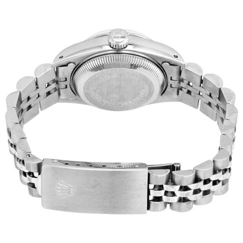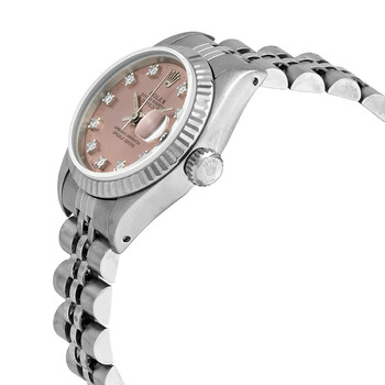 Silver-tone stainless steel case with a silver-tone stainless steel jubilee bracelet. Fixed fluted bezel. Pink dial with silver-tone hands and diamond hour markers. Dial Type: Analog. Luminescent hands. Date display at the 3 o'clock position. Rolex Calibre 2135 Automatic movement, containing 29 Jewels, bitting at 28800 vph, and has a power reserve of approximately 42 hours. Scratch resistant sapphire crystal. Screw down crown. Solid case back. Round case shape, case size: 26 mm. Fold over clasp. Water resistant at 100 meters / 330 feet. Functions: date, hour, minute, second, chronometer. Luxury watch style. Watch label: Swiss Made. Pre-owned Rolex Automatic Chronometer Diamond Pink Dial Ladies Watch 69174PDJ.