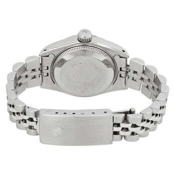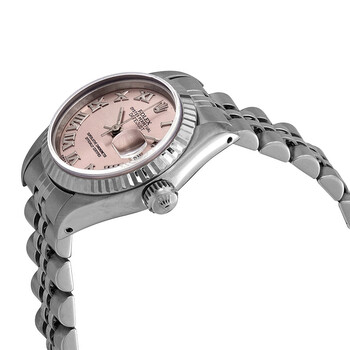 Silver-tone stainless steel case with a silver-tone stainless steel jubilee bracelet. Fixed fluted bezel. Pink dial with silver-tone hands and Roman numeral hour markers. Dial Type: Analog. Luminescent hands. Date display at the 3 o'clock position. Rolex Calibre 2135 Automatic movement, containing 29 Jewels, bitting at 28800 vph, and has a power reserve of approximately 42 hours. Scratch resistant sapphire crystal. Screw down crown. Solid case back. Round case shape. Case size: 26 mm. Fold over clasp. Water resistant at 100 meters / 330 feet. Functions: date, hour, minute, second, chronometer. Luxury watch style. Watch label: Swiss Made. Pre-owned Rolex Automatic Chronometer Pink Dial Ladies Watch 69174PRJ.
