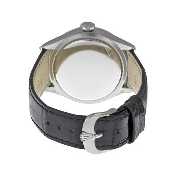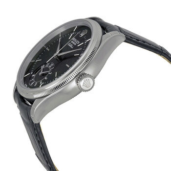 Silver-tone 18kt white gold case with a black (alligator) leather strap. Fixed domed fluted silver-tone 18kt white gold bezel. Black guilloche dial with white gold hands and index hour markers. Minute markers. Dial Type: Analog. 12 hour (GMT) at the 6 o'clock position subdials. Rolex Calibre 3180 Automatic movement, based upon Rolex 3130, containing 31 Jewels, bitting at 28800 vph, and has a power reserve of approximately 48 hours. Scratch resistant sapphire crystal. Pull / push crown. Solid case back. Round case shape, case size: 39 mm. Tang clasp. Water resistant at 50 meters / 165 feet. Functions: GMT, second time zone, hour, minute, second, day/night indicator, chronometer. Cellini Series. Luxury watch style. Watch label: Swiss Made. Pre-owned Rolex Cellini Automatic Chronometer Men's Watch 50529BKSBKL.