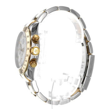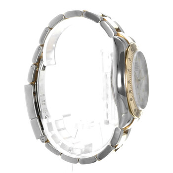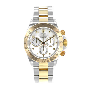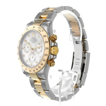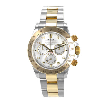 Silver-tone stainless steel case with a two-tone (silver-tone and yellow gold-tone) stainless steel and 18kt yellow gold oyster bracelet. Fixed tachymeter scale yellow gold-tone 18kt yellow gold bezel. Mother of pearl dial with yellow gold-tone hands and Arabic numeral hour markers. Minute markers around the outer rim. Dial Type: Analog. Chronograph - three sub-dials displaying: 60 second, 30 minute and 12 hour. Rolex Calibre 4130 Automatic movement, based upon Rolex 4030, containing 44 Jewels, bitting at 28800 vph, and has a power reserve of approximately 72 hours. Scratch resistant sapphire crystal. Screw down crown. Solid case back. Round case shape, case size: 40 mm. Fold over clasp with a safety release. Water resistant at 100 meters / 330 feet. Functions: chronograph, hour, minute, small second, chronometer. Cosmograph Daytona Series. Luxury watch style. Watch label: Swiss Made. Pre-owned Rolex Cosmograph Daytona Chronograph Automatic Chronometer Men's Watch 116523 MAO.