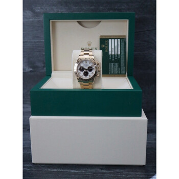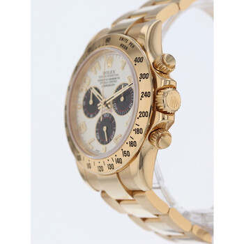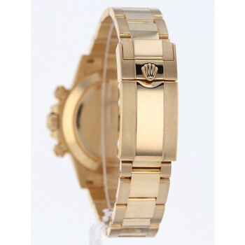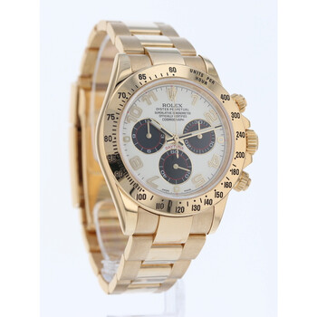 Yellow gold-tone 18kt yellow gold case with a yellow gold-tone 18kt yellow gold oyster bracelet. Fixed tachymeter scale yellow gold-tone 18kt yellow gold bezel. White dial with yellow gold-tone hands and Arabic numeral hour markers. Minute markers around the outer rim. Dial Type: Analog. Luminescent hands and markers. Chronograph - sub-dials displaying: 60 second, 30 minute, 12 hour. Rolex Calibre 4130 Automatic movement, based upon Rolex 4030, containing 44 Jewels, bitting at 28800 vph, and has a power reserve of approximately 72 hours. Scratch resistant sapphire crystal. Screw down crown. Solid case back. Round case shape, case size: 40 mm. Fold over clasp with a safety release. Water resistant at 100 meters / 330 feet. Functions: chronograph, hour, minute, small second, chronometer. Cosmograph Daytona Series. Luxury watch style. Watch label: Swiss Made. Pre-owned Rolex Cosmograph Daytona Chronograph Automatic Chronometer White Dial Men's Watch 116528 WAO.