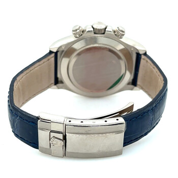 18kt white gold case with a blue leather strap. Fixed with 48 baguette diamonds and 12 sapphires compass compass 18kt white gold bezel. Diamond dial with silver-tone hands and Roman numeral hour markers. Dial Type: Analog. Luminescent hands. Chronograph - three sub-dials displaying: 60 second, 30 minute and 12 hour. Rolex Calibre 4130 Automatic movement, based upon Rolex 4030, containing 44 Jewels, bitting at 28800 vph, and has a power reserve of approximately 72 hours. Scratch resistant sapphire crystal. Screw down crown. Solid case back. Round case shape, case size: 40 mm, case thickness: 12 mm. Band width: 20 mm. Fold over clasp. Water resistant at 100 meters / 330 feet. Functions: chronograph, hour, minute, second. Cosmograph Daytona Series. Luxury watch style. Watch label: Swiss Made. Pre-owned Rolex Cosmograph Daytona Chronograph Automatic Men's Watch 116599-12SA.