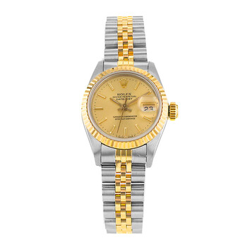 Silver-tone stainless steel case with a two-tone (silver-tone and yellow gold-tone) stainless steel and 18kt yellow gold jubilee bracelet. Fixed yellow gold-tone 18kt yellow gold bezel. Gold-tone dial with yellow gold-tone hands and index hour markers. Minute markers around the outer rim. Dial Type: Analog. Date display at the 3 o'clock position. Rolex Calibre 2135 Automatic movement, containing 29 Jewels, bitting at 28800 vph, and has a power reserve of approximately 42 hours. Screw down crown. Solid case back. Round case shape, case size: 26 mm. Fold over clasp with a safety release. Functions: date, hour, minute, second, chronometer. Datejust 26 Series. Luxury watch style. Watch label: Swiss Made. Pre-owned Rolex Datejust 26 Automatic Chronometer Gold Dial Ladies Watch 69173 CSJ.