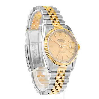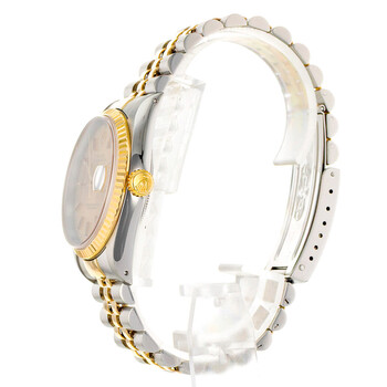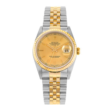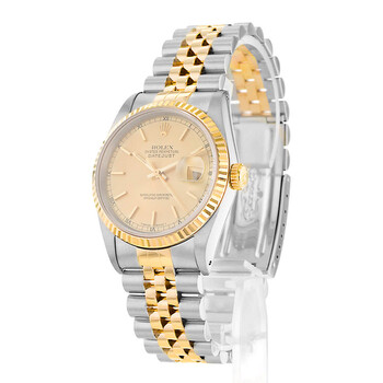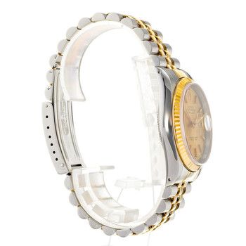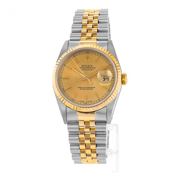 Silver-tone stainless steel case with a two-tone (silver-tone and yellow gold-tone) stainless steel and 18kt yellow gold jubilee bracelet. Fixed yellow gold-tone 18kt yellow gold bezel. Gold-tone dial with yellow gold-tone hands and index hour markers. Minute markers around the outer rim. Dial Type: Analog. Date display at the 3 o'clock position. Rolex Calibre 2135 Automatic movement, containing 29 Jewels, bitting at 28800 vph, and has a power reserve of approximately 42 hours. Screw down crown. Solid case back. Round case shape, case size: 26 mm. Fold over clasp with a safety release. Functions: date, hour, minute, second, chronometer. Datejust 26 Series. Luxury watch style. Watch label: Swiss Made. Pre-owned Rolex Datejust 26 Automatic Chronometer Gold Dial Men's Watch 69173 CSJ.