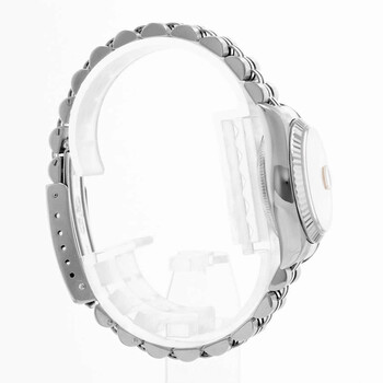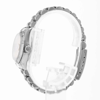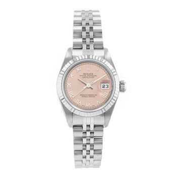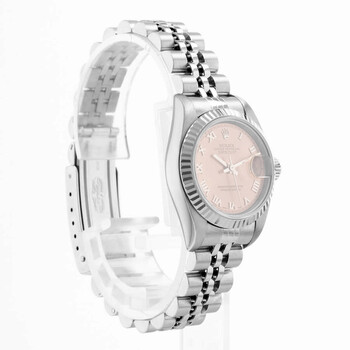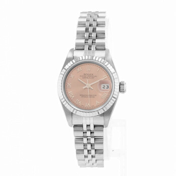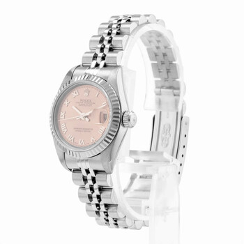 Silver-tone stainless steel case with a silver-tone stainless steel jubilee bracelet. Fixed silver-tone stainless steel bezel. Pink dial with silver-tone hands and Roman numeral hour markers. Minute markers around the outer rim. Dial Type: Analog. Date display at the 3 o'clock position. Rolex Calibre 2235 Automatic movement, containing 31 Jewels, bitting at 28800 vph, and has a power reserve of approximately 48 hours. Screw down crown. Solid case back. Round case shape, case size: 26 mm. Fold over clasp with a safety release. Functions: date, hour, minute, second, chronometer. Datejust 26 Series. Luxury watch style. Watch label: Swiss Made. Pre-owned Rolex Datejust 26 Automatic Chronometer Pink Dial Ladies Watch 79174 PRJ.