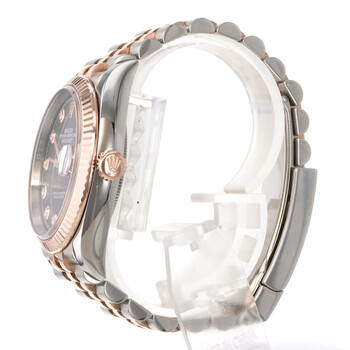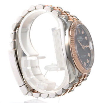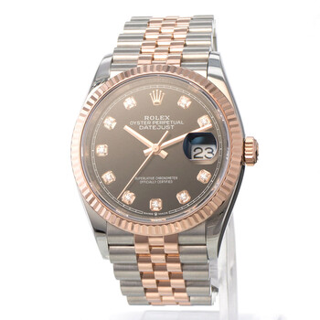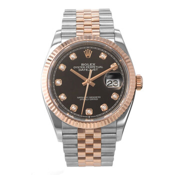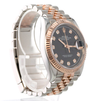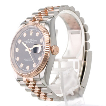 Silver-tone stainless steel case with a two-tone (silver-tone and rose gold-tone) stainless steel and 18kt rose gold jubilee bracelet. Fixed rose gold-tone 18kt rose gold bezel. Black dial with rose gold-tone hands and diamond hour markers. Minute markers around the outer rim. Dial Type: Analog. Date display at the 3 o'clock position. Rolex Calibre 3235 Automatic movement, based upon Rolex 3035, containing 31 Jewels, bitting at 28800 vph, and has a power reserve of approximately 70 hours. Scratch resistant sapphire crystal. Screw down crown. Solid case back. Round case shape, case size: 36 mm. Fold over clasp with a safety release. Water resistant at 100 meters / 330 feet. Functions: date, hour, minute, second, chronometer. Datejust 36 Series. Luxury watch style. Watch label: Swiss Made. Item Variations: 126231BKDJ, 126231-0019. Pre-owned Rolex Datejust 36 Automatic Chronometer Diamond Black Dial Men's Watch 126231 BKDJ.