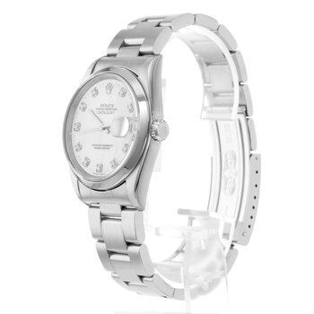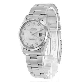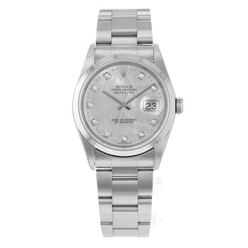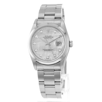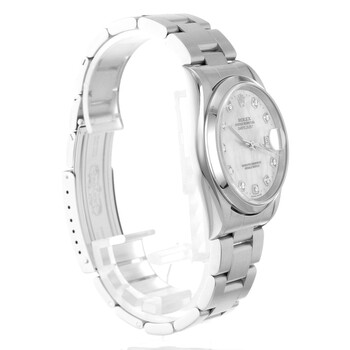 Silver-tone stainless steel case with a silver-tone stainless steel oyster bracelet. Fixed silver-tone stainless steel bezel. Mother of pearl dial with silver-tone hands and diamond hour markers. Minute markers around the outer rim. Dial Type: Analog. Date display at the 3 o'clock position. Rolex Calibre 3135 Automatic movement, containing 31 Jewels, bitting at 28800 vph, and has a power reserve of approximately 48 hours. Scratch resistant sapphire crystal. Screw down crown. Solid case back. Round case shape, case size: 36 mm. Fold over clasp with a safety release. Water resistant at 100 meters / 330 feet. Functions: date, hour, minute, second, chronometer. Datejust 36 Series. Luxury watch style. Watch label: Swiss Made. Pre-owned Rolex Datejust 36 Automatic Chronometer Diamond Men's Watch 16200 MDO.