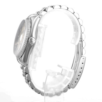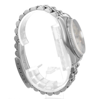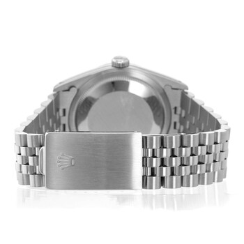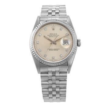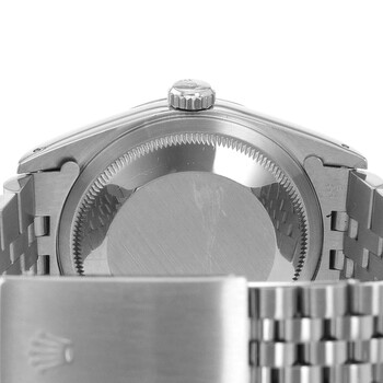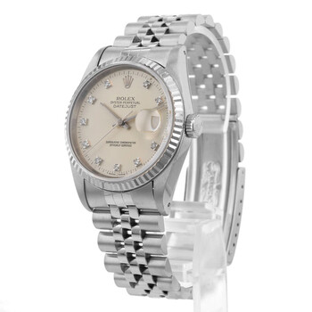 Silver-tone stainless steel case with a silver-tone stainless steel jubilee bracelet. Fixed 18kt white gold bezel. Silver-tone dial with silver-tone hands and diamond hour markers. Minute markers around the outer rim. Dial Type: Analog. Luminescent hands. Date display at the 3 o'clock position. Rolex Calibre 3135 Automatic movement, containing 31 Jewels, bitting at 28800 vph, and has a power reserve of approximately 48 hours. Scratch resistant sapphire crystal. Screw down crown. Solid case back. Round case shape, case size: 36 mm. Fold over clasp with a safety release. Functions: date, hour, minute, second, chronometer. Datejust 36 Series. Luxury watch style. Watch label: Swiss Made. Pre-owned Rolex Datejust 36 Automatic Chronometer Diamond Silver Dial Men's Watch 16234 SDJ.