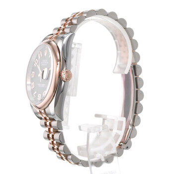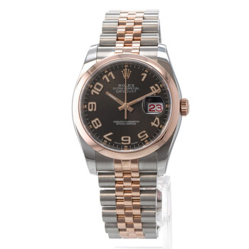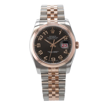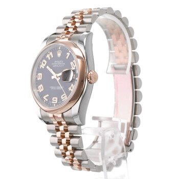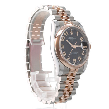 Silver-tone stainless steel case with a two-tone (silver-tone and rose gold-tone) stainless steel and 18kt rose gold jubilee bracelet. Fixed rose gold-tone 18kt rose gold bezel. Black concentric circle dial with rose gold-tone hands and Arabic numeral hour markers. Minute markers around the outer rim. Dial Type: Analog. Luminescent hands and markers. Date display at the 3 o'clock position. Rolex Calibre 3135 Automatic movement, containing 31 Jewels, bitting at 28800 vph, and has a power reserve of approximately 48 hours. Scratch resistant sapphire crystal. Screw down crown. Solid case back. Round case shape, case size: 36 mm. Fold over clasp with a safety release. Water resistant at 100 meters / 330 feet. Functions: date, hour, minute, second, chronometer. Datejust 36 Series. Luxury watch style. Watch label: Swiss Made. Pre-owned Rolex Datejust 36 Automatic Chronometer Men's Watch 116201 BKCAJ.