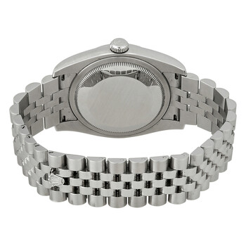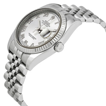 Stainless steel case with a stainless steel Rolex jubilee bracelet. Fixed fluted 18kt white gold bezel. Rhodium dial with silver-tone hands and Roman numeral hour markers. Dial Type: Analog. Date display at the 3 o'clock position. Rolex calibre 3135 automatic movement with a 48-hour power reserve. Scratch resistant sapphire crystal. Screw down crown. Solid case back. Case size: 36 mm. Round case shape. Concealed crown clasp. Water resistant at 100 meters / 330 feet. Functions: date, hour, minute, second. Luxury watch style. Watch label: Swiss Made. Rolex Datejust 36 Rhodium Dial Steel and 18K White Gold Men's Watch 116234RRJ.