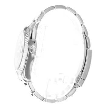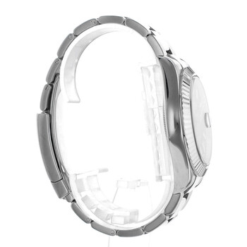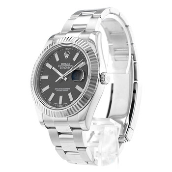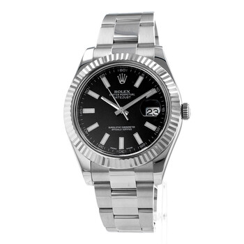 Silver-tone stainless steel case with a silver-tone stainless steel oyster bracelet. Fixed 18kt white gold bezel. Black dial with silver-tone hands and index hour markers. Minute markers around the outer rim. Dial Type: Analog. Luminescent hands and markers. Date display at the 3 o'clock position. Rolex Calibre 3136 Automatic movement, based upon Rolex 3135, containing 31 Jewels, bitting at 28800 vph, and has a power reserve of approximately 48 hours. Scratch resistant sapphire crystal. Screw down crown. Solid case back. Round case shape, case size: 41 mm. Fold over clasp with a safety release. Water resistant at 100 meters / 330 feet. Functions: date, hour, minute, second, chronometer. Datejust 41 Series. Luxury watch style. Watch label: Swiss Made. Item Variations: 116334-72210. Pre-owned Rolex Datejust 41 Automatic Chronometer Black Dial Men's Watch 116334 BKSO.