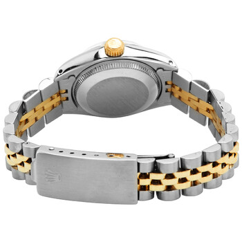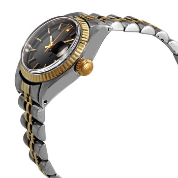 Silver-tone stainless steel case with a 18kt yellow gold and stainless steel jubilee bracelet. Fixed fluted gold-tone 18kt yellow gold bezel. Black dial with gold-tone hands and index hour markers. Minute markers around the outer rim. Dial Type: Analog. Date display at the 3 o'clock position. Rolex Calibre 2135 Automatic movement, containing 29 Jewels, bitting at 28800 vph, and has a power reserve of approximately 42 hours. Scratch resistant sapphire crystal. Screw down crown. Round case shape, case size: 26 mm. Water resistant at 100 meters / 330 feet. Functions: hours, minutes, seconds, date. Datejust Series. Luxury watch style. Watch label: Swiss Made. Pre-owned Rolex Datejust Automatic Black Dial Ladies Watch 69173BKSJ.