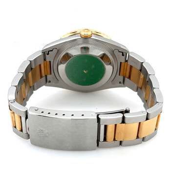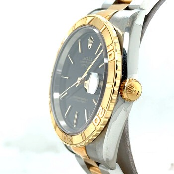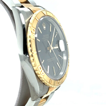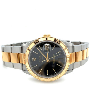 Silver-tone stainless steel case with a two-tone (silver-tone and yellow gold-tone) 18kt yellow gold and stainless steel oyster bracelet. Turn-o-graph yellow gold-tone 18kt yellow gold bezel. Black dial with yellow gold-tone hands and index hour markers. Minute markers around the outer rim. Dial Type: Analog. Date display at the 3 o'clock position. Rolex Calibre 3135 Automatic movement, containing 31 Jewels, bitting at 28800 vph, and has a power reserve of approximately 48 hours. Scratch resistant sapphire crystal. Screw down crown. Solid case back. Round case shape, case size: 36 mm, case thickness: 15 mm. Band width: 20 mm. Fold over clasp with a safety release. Water resistant at 100 meters / 330 feet. Functions: date, hour, minute, second. Datejust Series. Luxury watch style. Watch label: Swiss Made. Pre-owned Rolex Datejust Automatic Black Dial Men's Watch 16263 BKSO.