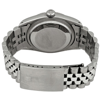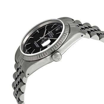 Silver-tone stainless steel case with a silver-tone stainless steel jubilee bracelet. Fixed fluted 18kt white gold bezel. Black dial with luminous hands and luminous stick hour markers. Minute markers around the outer rim. Dial Type: Analog. Date display at the 3 o'clock position. Rolex Calibre 3135 Automatic movement, containing 31 Jewels, bitting at 28800 vph, and has a power reserve of approximately 48 hours. Scratch resistant sapphire crystal. Solid case back. Round case shape, case size: 31 mm, case thickness: 12 mm. Water resistant at 100 meters / 330 feet. Functions: hours, minutes, seconds, date. Datejust Series. Luxury watch style. Watch label: Swiss Made. Pre-owned Rolex Datejust Automatic Black Dial Men's Watch U-RLX16234BKSJ.