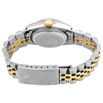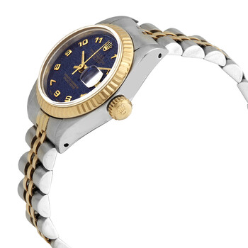 Silver-tone stainless steel case with a 18kt yellow gold and stainless steel jubilee bracelet. Fixed fluted gold-tone 18kt yellow gold bezel. Blue dial with gold-tone hands and Arabic numeral hour markers. Minute markers around the outer rim. Dial Type: Analog. Date display at the 3 o'clock position. Chronograph - two sub-dials displaying: 60 second and 30 minute. Rolex Calibre 2135 Automatic movement, containing 29 Jewels, bitting at 28800 vph, and has a power reserve of approximately 42 hours. Scratch resistant sapphire crystal. Screw down crown. Solid case back. Round case shape, case size: 26 mm. Band length: 6 3/4 inches. Oyster clasp. Water resistant at 100 meters / 330 feet. Functions: hours, minutes, seconds, date. Datejust Series. Luxury watch style. Watch label: Swiss Made. Pre-owned Rolex Datejust Automatic Blue Dial Ladies Watch 69173BLSJ.