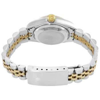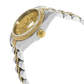 Silver-tone stainless steel case with a two-tone (silver-tone and gold-tone) 18kt yellow gold and stainless steel jubilee bracelet. Fluted fixed gold-tone 18kt yellow gold bezel. Champagne dial with gold-tone hands and diamond hour markers. Minute markers around the outer rim. Dial Type: Analog. Luminescent hands. Date display at the 3 o'clock position. Rolex Calibre 2235 Automatic movement, containing 31 Jewels, bitting at 28800 vph, and has a power reserve of approximately 48 hours. Scratch resistant sapphire crystal. Screw down crown. Solid case back. Round case shape, case size: 26 mm. Band length: 6 1/4 inches. Fold over clasp. Water resistant at 100 meters / 330 feet. Functions: date, hour, minute, second, chronometer. Datejust Series. Luxury watch style. Watch label: Swiss Made. Pre-owned Rolex Datejust Automatic Chronometer Diamond Champagne Dial Ladies Watch 79173CSJ.
